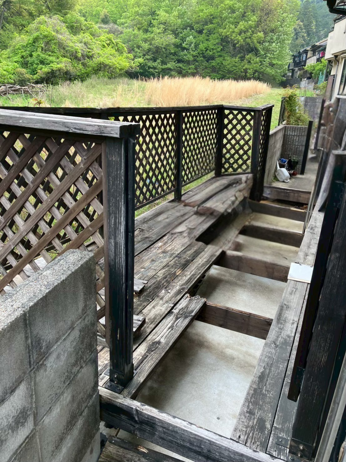 木製デッキの腐食・変色が全体に進行/手すり・フェンス部分も老朽化で強度が低下/見た目の悪さが気になっていた/「危ないとわかっていても、どこに頼めばいいかわからない」という状況